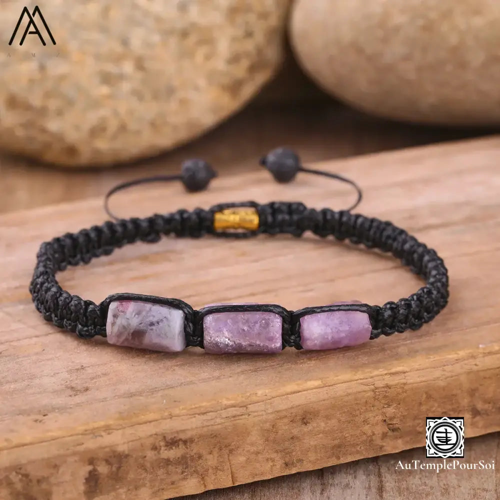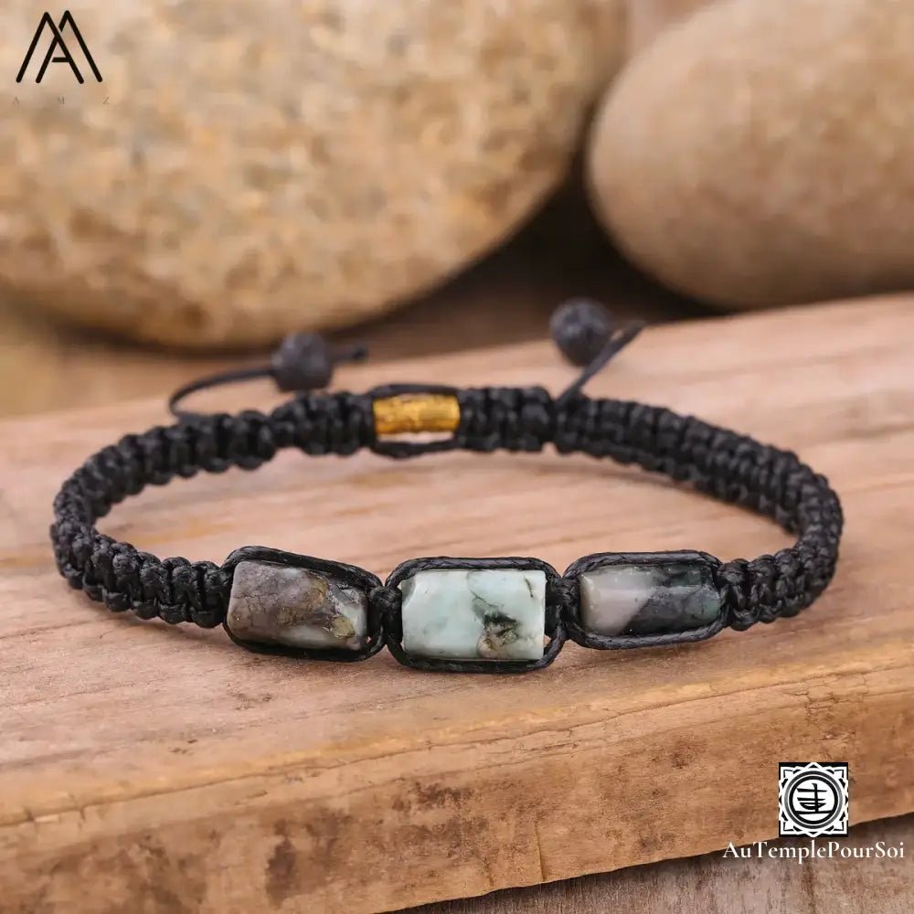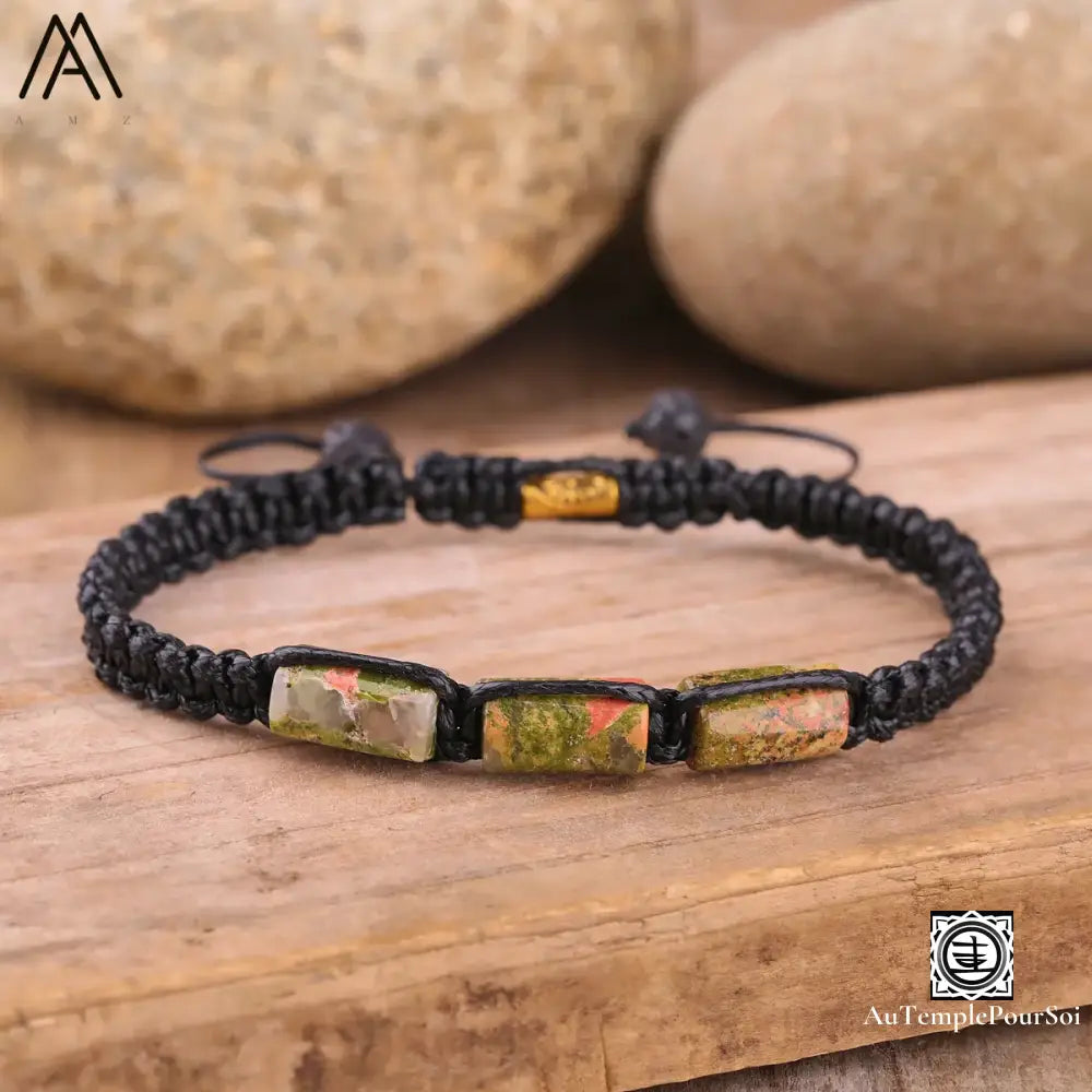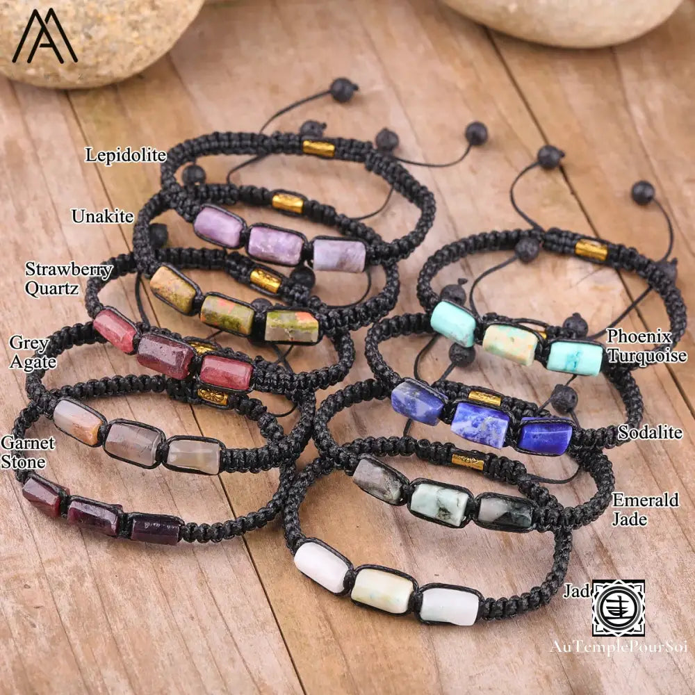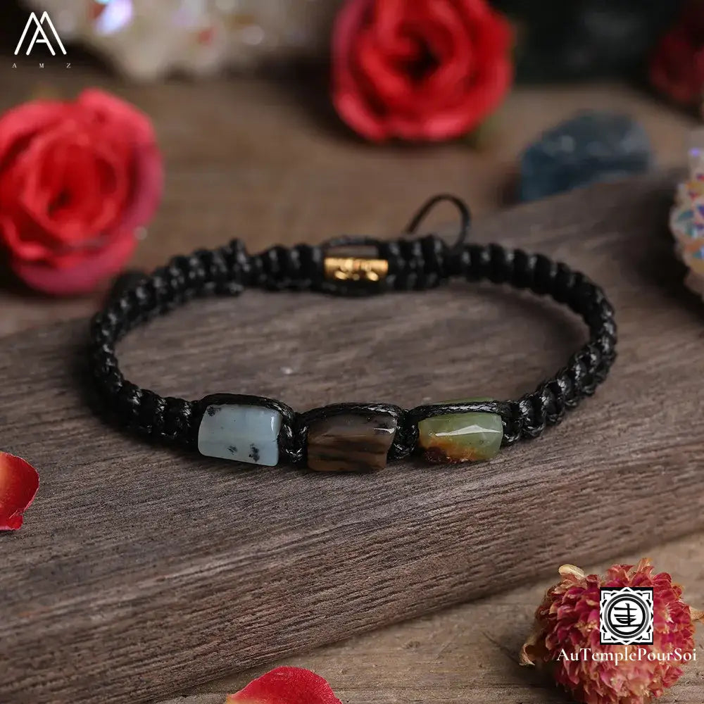 Each stone has been meticulously chosen for its unique lithotherapy qualities, forming a bracelet that is not only aesthetically striking but also rich in healing virtues. The black braided design creates a beautiful contrast that brings out the vibrant colors and varied textures of the stones, while the adjustable mechanism ensures perfect comfort for any wrist size.