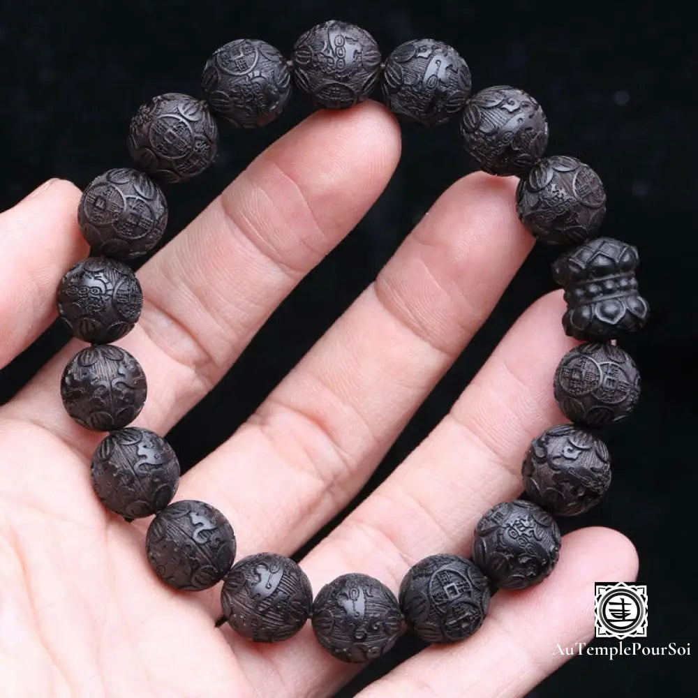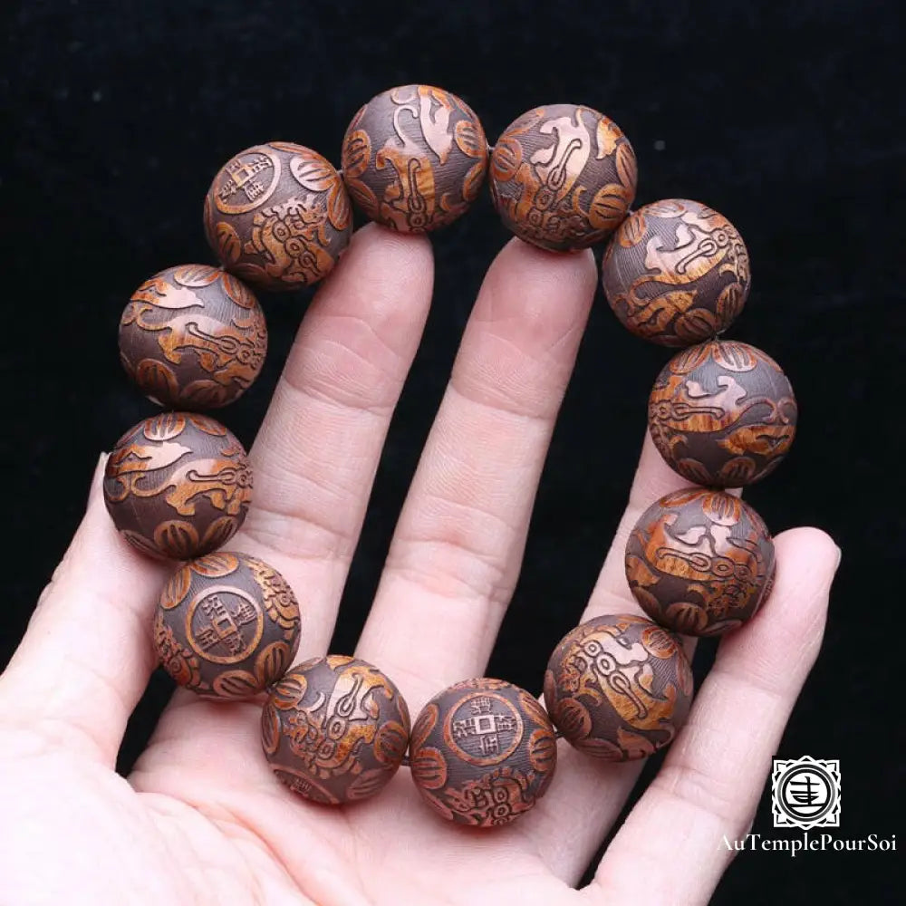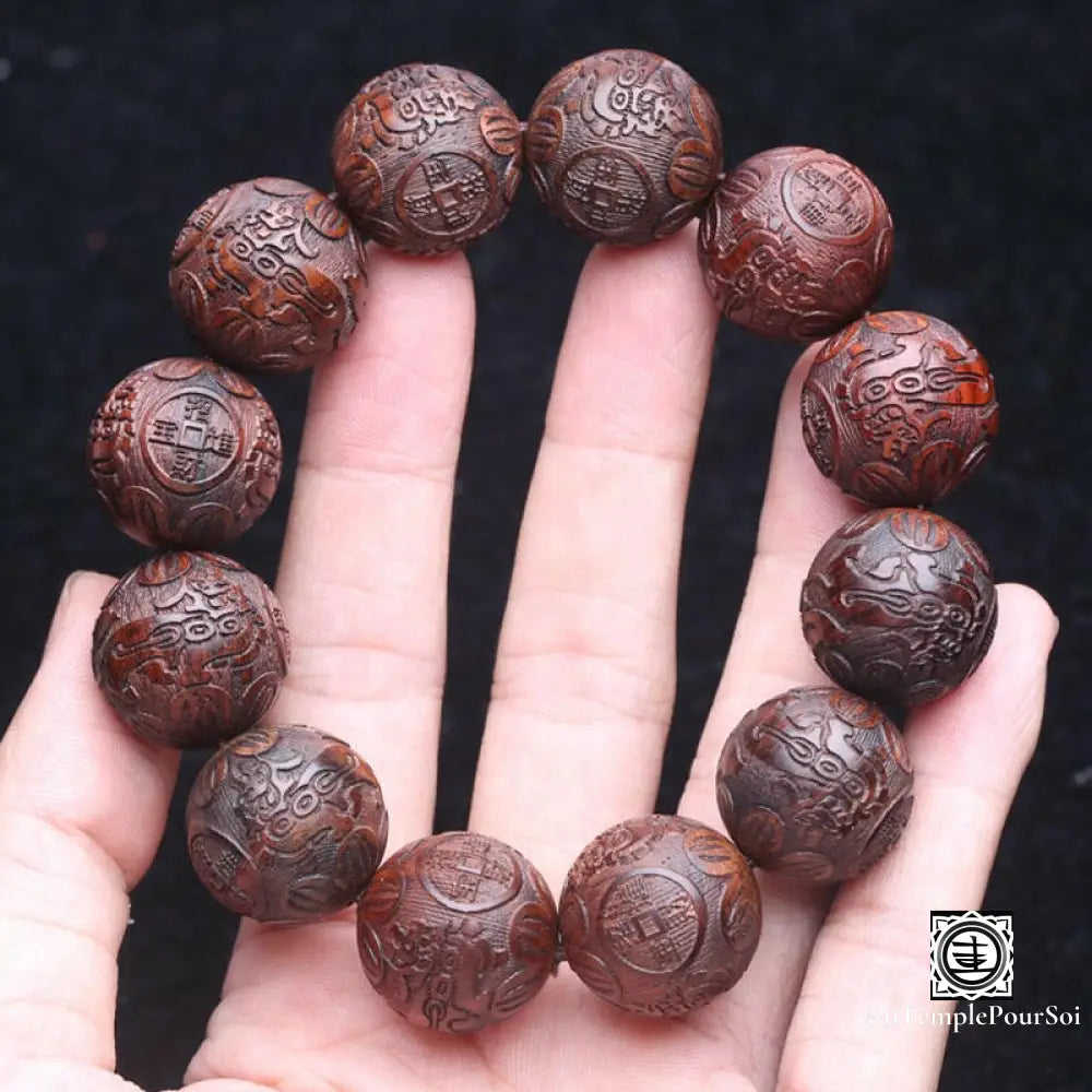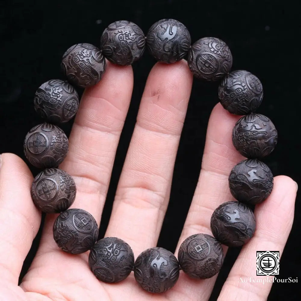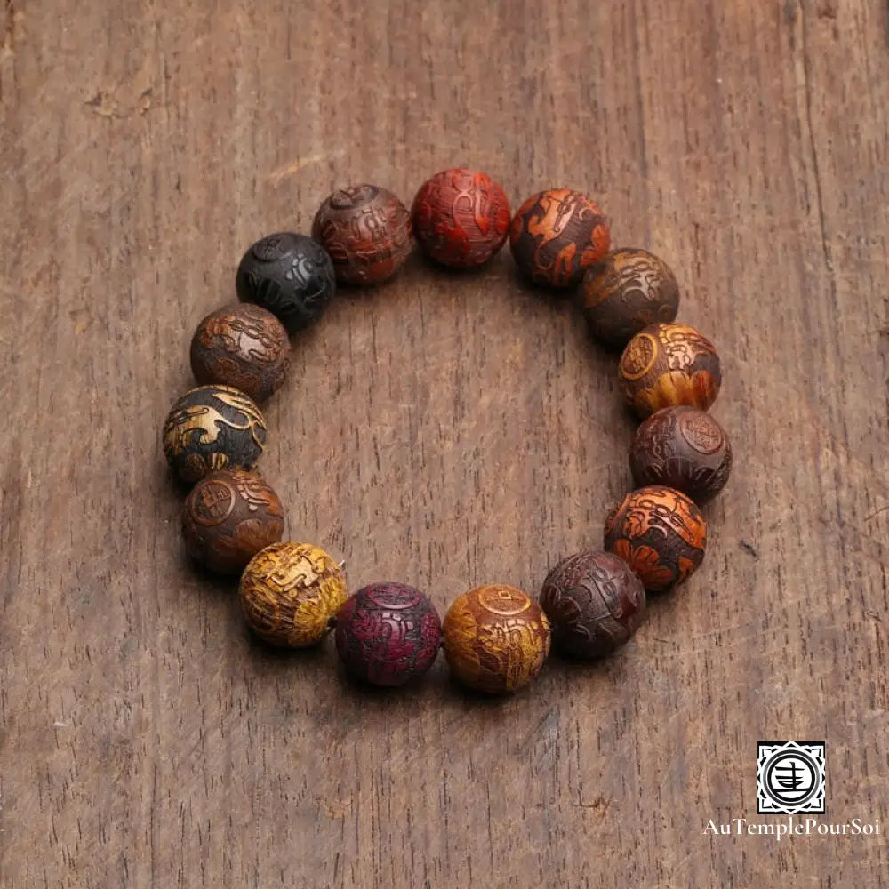 de 12 cuentas talladas en madera de wengué, esta pulsera está decorada con 12