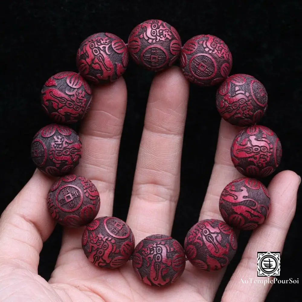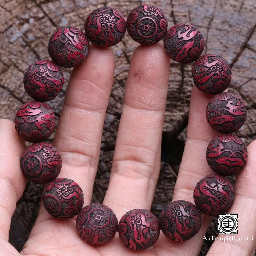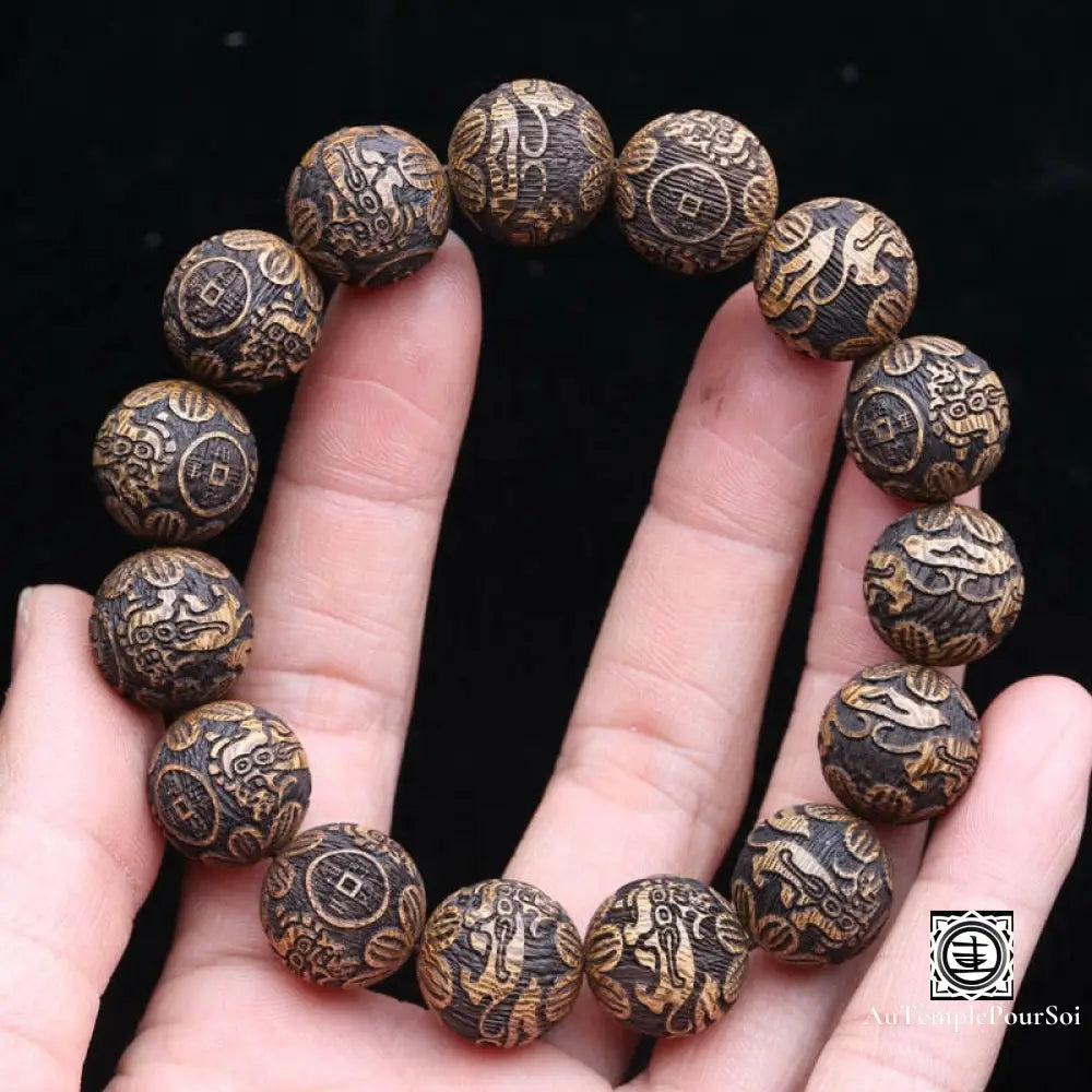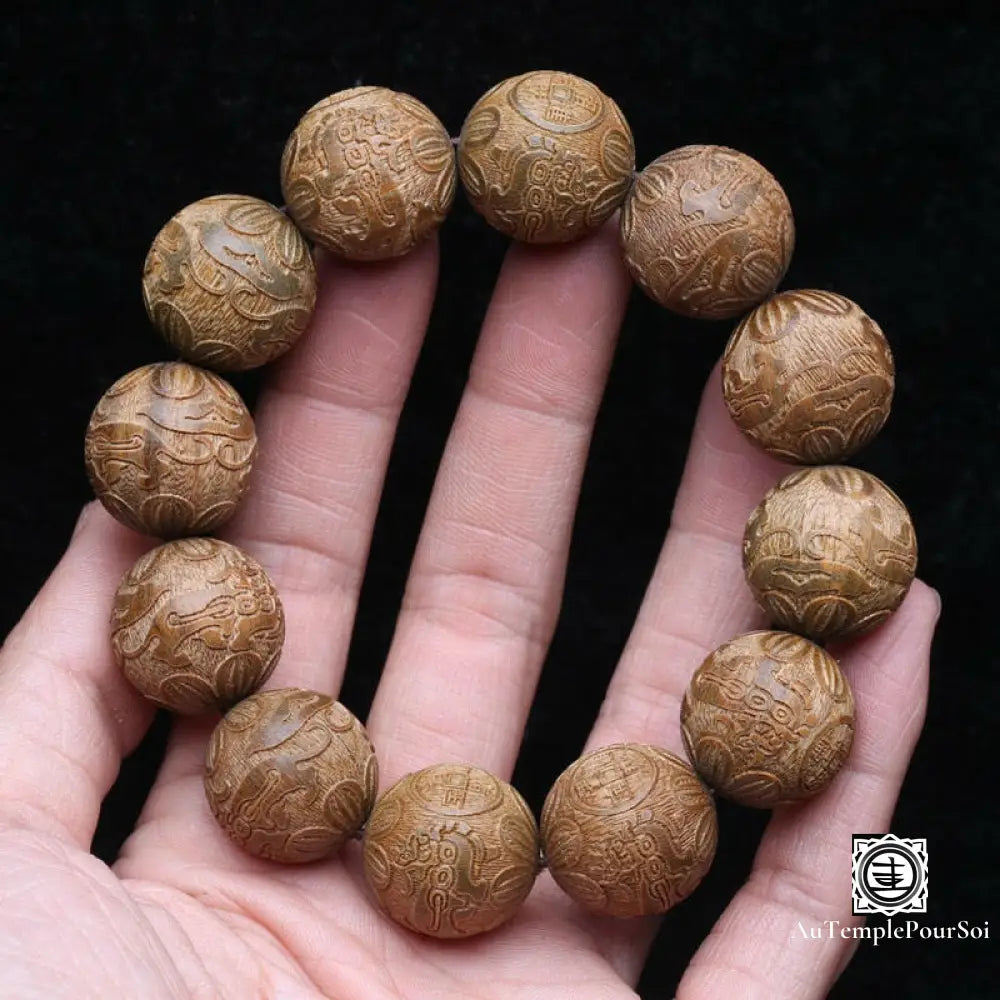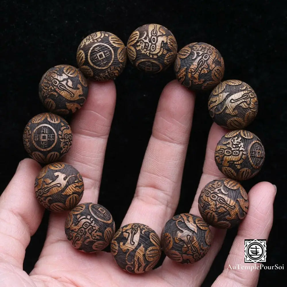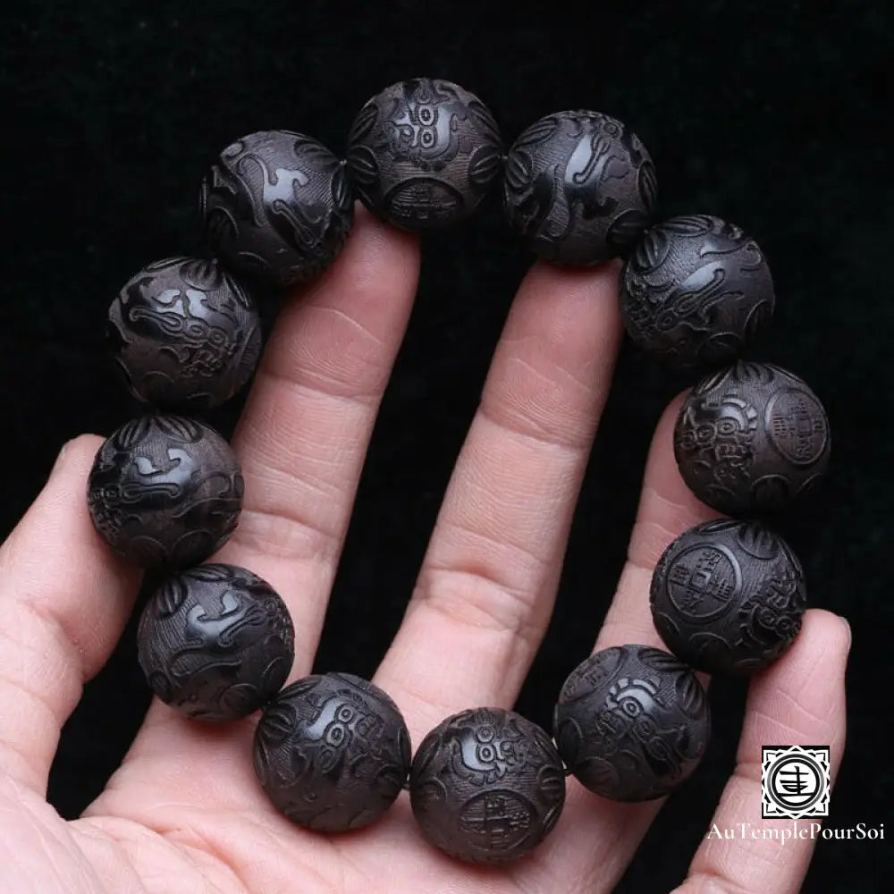 de 12 cuentas talladas en madera de wengué, esta pulsera está decorada con 12