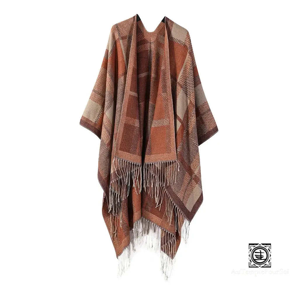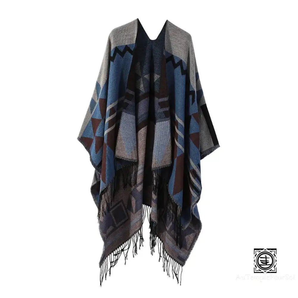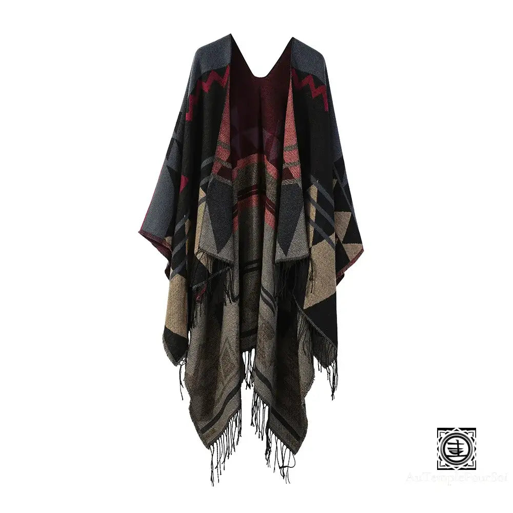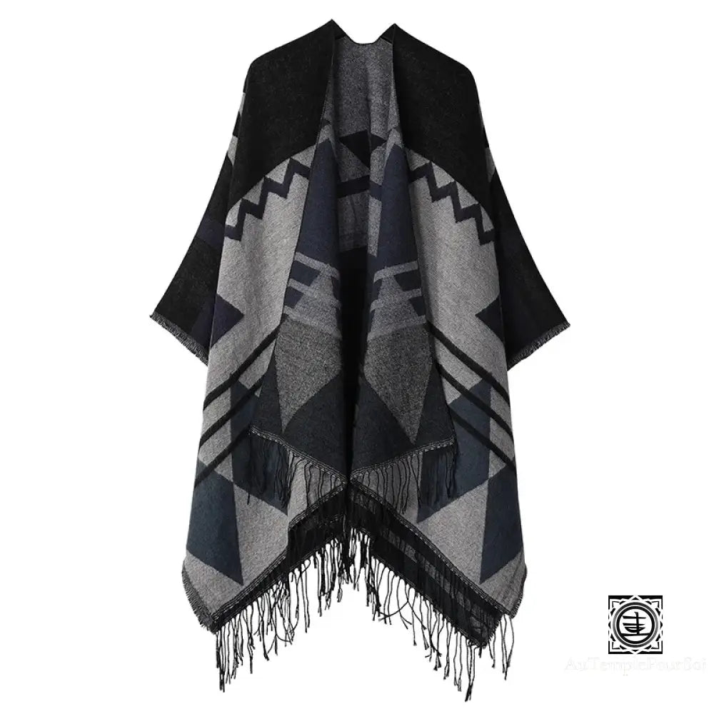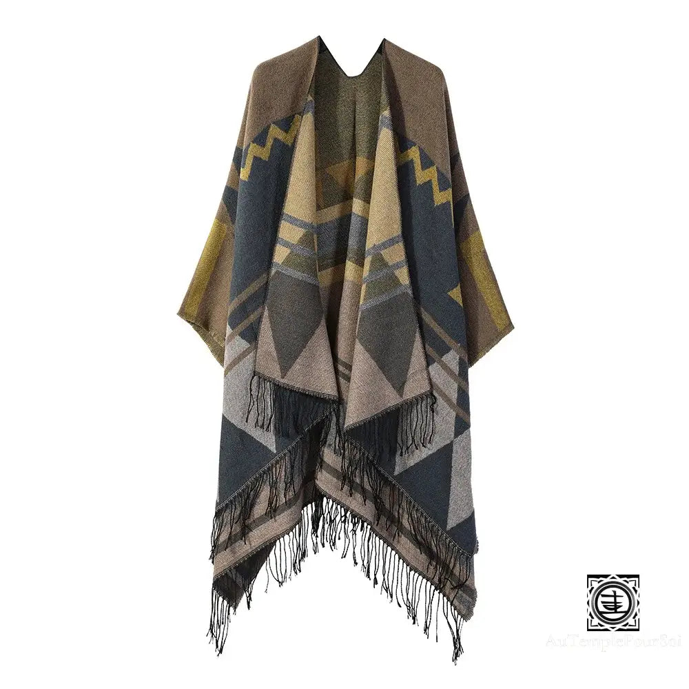 Poncho Oversize Géométrique en Laine Mélangée avec Franges
