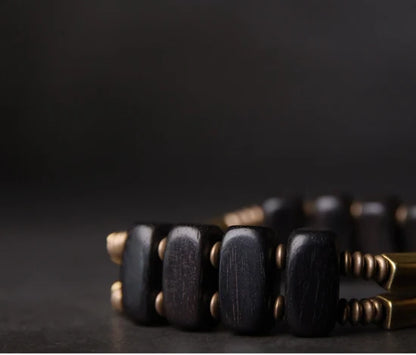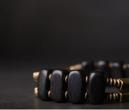 Les perles rectangulaires d’ébène, finement polies, apportent une touche brute et organique, tandis que les tiges de cuivre aux courbes douces diffusent une énergie chaleureuse et protectrice.